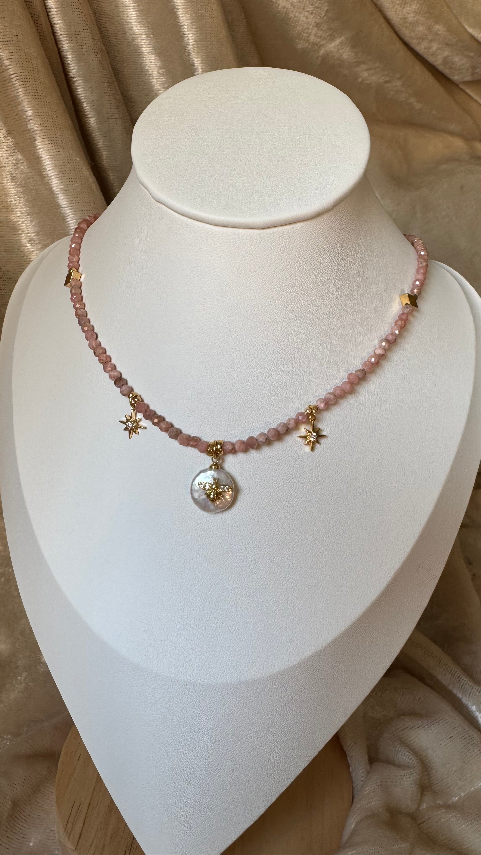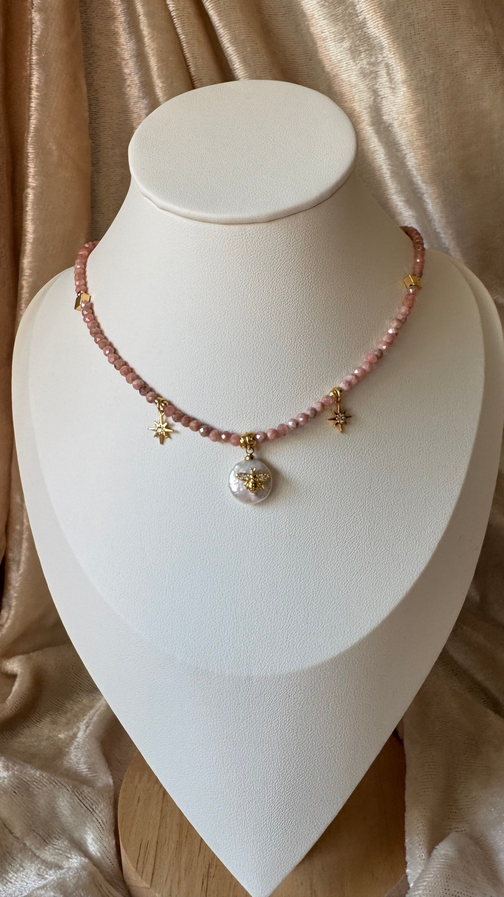 Le collier Alya incarne la douceur et le raffinement. Composé de perles fines rosées et orné de pendentifs dorés en forme d’étoiles, il brille d’une lumière subtile et féminine. Au centre, une médaille nacrée rehaussée d’une abeille dorée ajoute une touche poétique et précieuse.